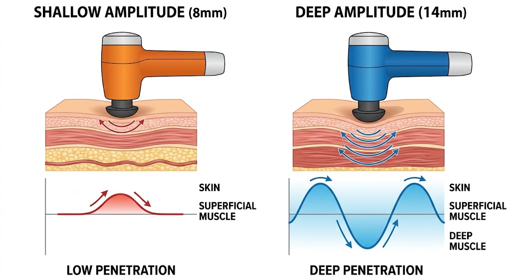 右:深い振幅(14mm): 振動が皮膚、浅層筋を通り抜け、深層の筋肉(深層筋)までしっかりと到達しています。お尻や太ももなど、大きな筋肉をほぐすのに適しています。
