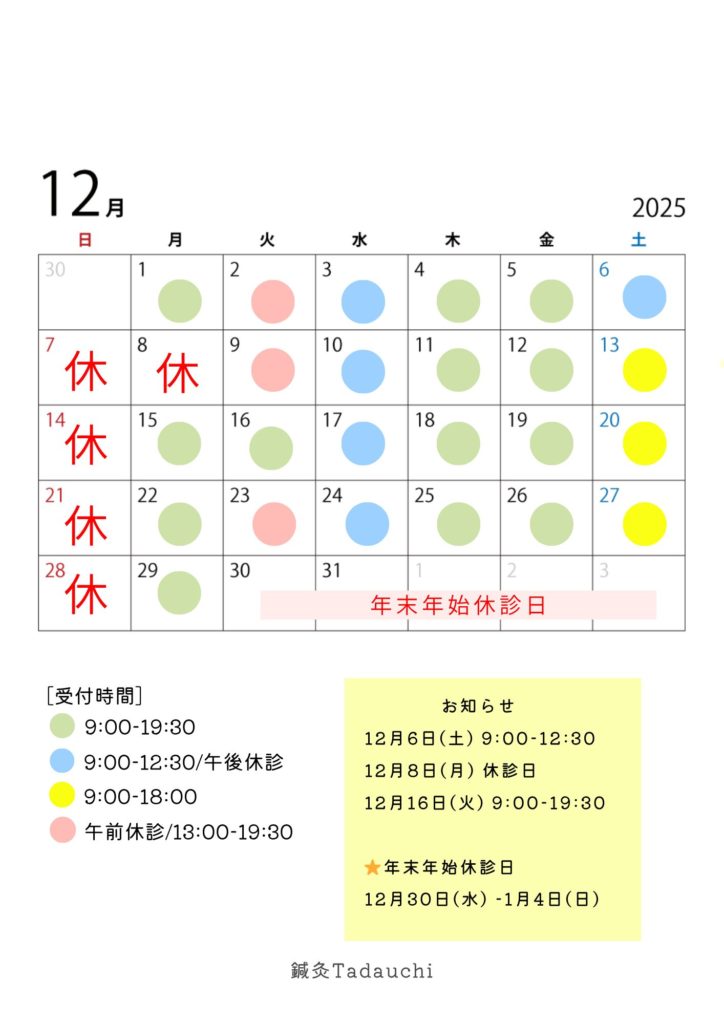 遅ればせながら今月の診療日カレンダーと年末年始休暇のお知らせです。